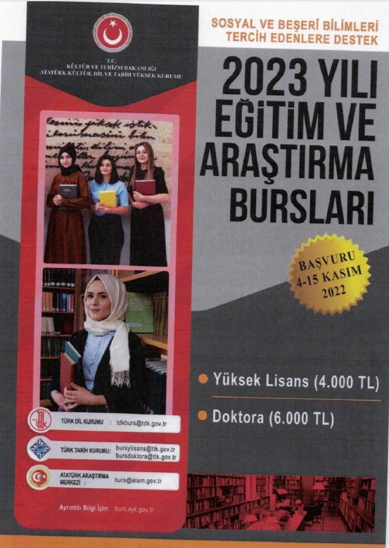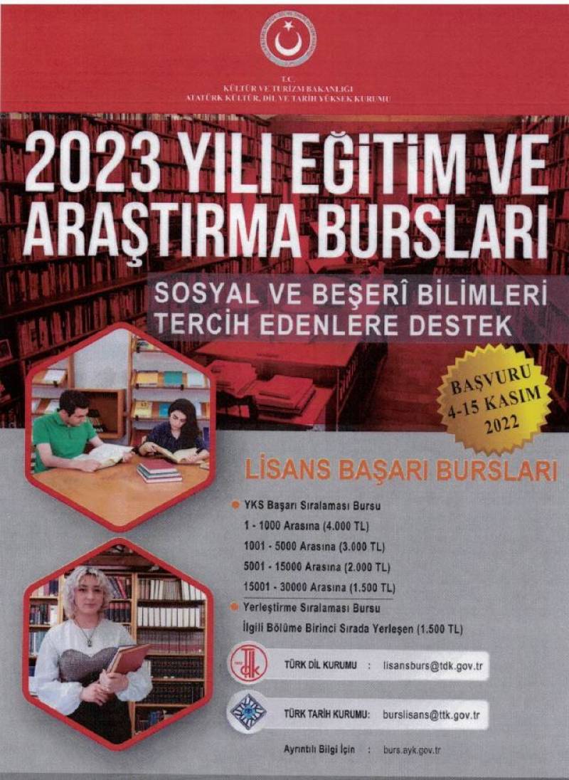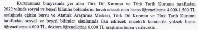 Atatürk Kültür, Dil ve Tarih Yüksek Kurumu bünyesinde yer alan Türk Dil Kurumu ve Türk Tarih Kurumu tarafından 2023 yılı burs başvuru ilan metninde yer verilen ilgili bölümleri tercih eden öğrencilere en düşüğü aylık 1.500 TL olmak üzere 4.000 TL’ye kadar lisans burs desteği sağlanacaktır.