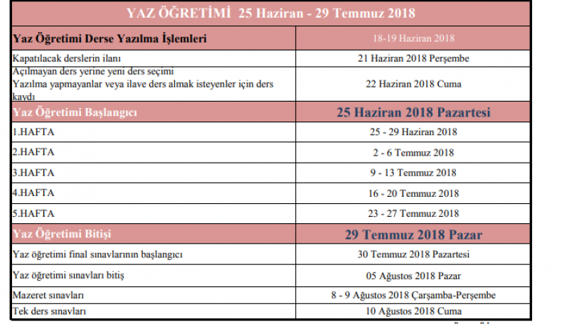2017-2018 Yaz Öğretimi dönemi için açılması planlanan derslerin haftalık programı belirlenmiştir. Duyuru ekinden ilgili Yaz Öğretimi programını ve esaslarını indirebilirsiniz.