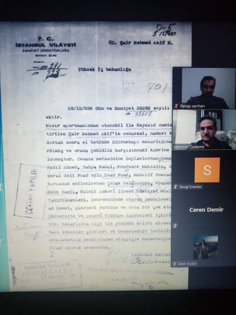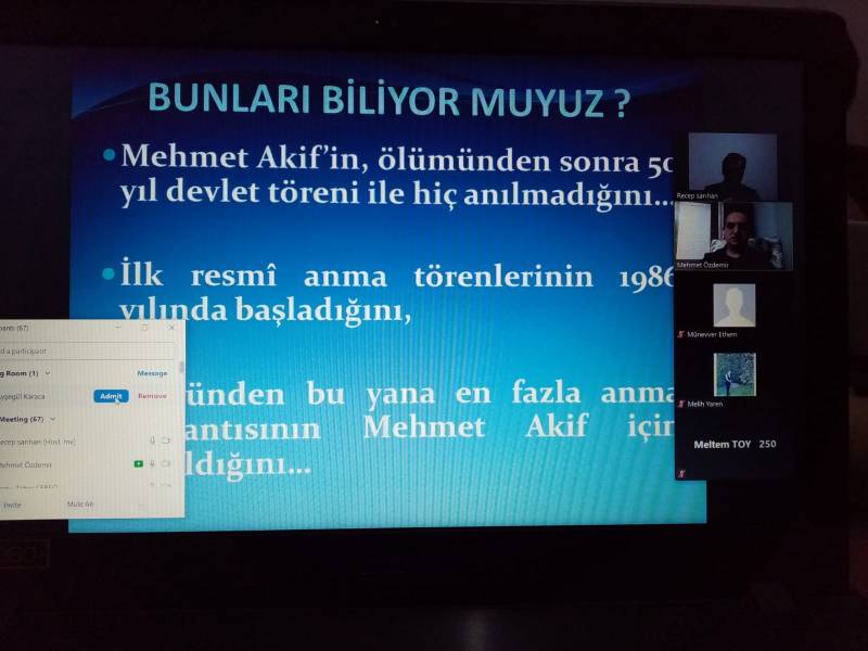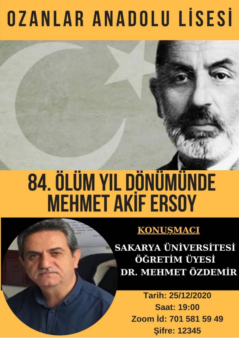 İstiklal Şairi Mehmet Akif Ersoy, vefatının 84. yılında Ozanlar Anadolu Lisesi’nin düzenlediği çevrim içi gerçekleştirilen konferans ile anıldı. Ozanlar Anadolu Lisesi Müdürü Recep Sarıhan’ın organize ettiği konferansın konuşmacısı Sakarya Üniversitesi Öğretim Üyesi ve Türkçe Eğitimi Anabilim Dalı Başkanı Dr. Mehmet Özdemir idi. Özdemir, İstiklal Şairimiz Mehmet Akif Ersoy’un hayatını farklı açılardan ele aldığı, tarihi belge ve bilgilerin yer verildiği konferans yaklaşık iki saat sürdü.